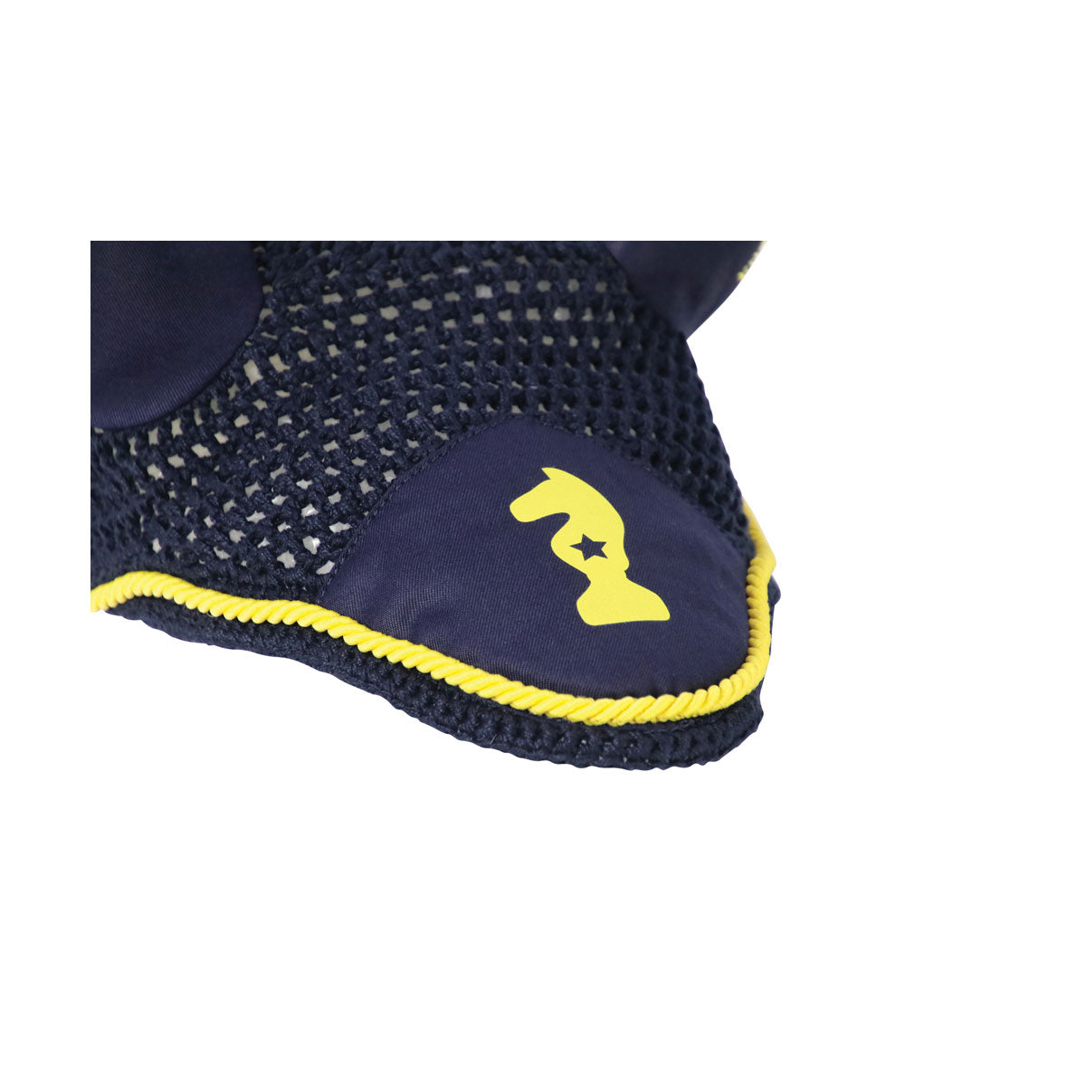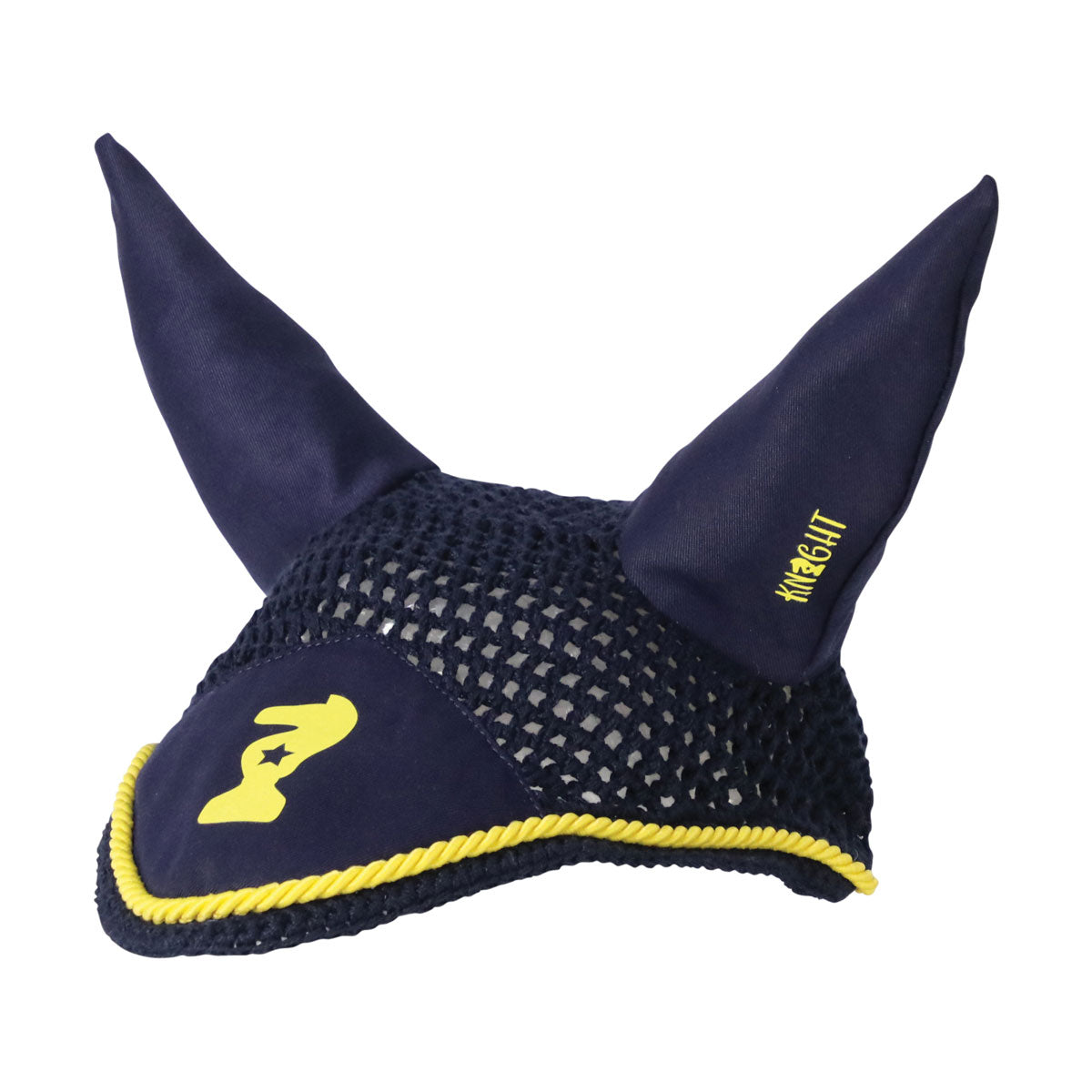 Ride like a knight with the Lancelot Fly Veil! This navy, close-knit crochet fly veil complete with contrasting yellow cord detail, breathable ears and the Little Knight emblem on the front is a must have accessory. This fly veil co-ordinates perfectly with the Little Knight Lancelot range, including matching saddle pad.